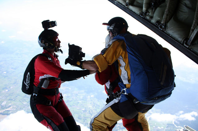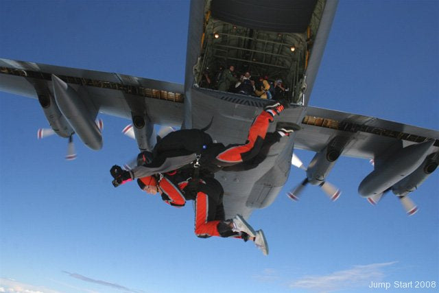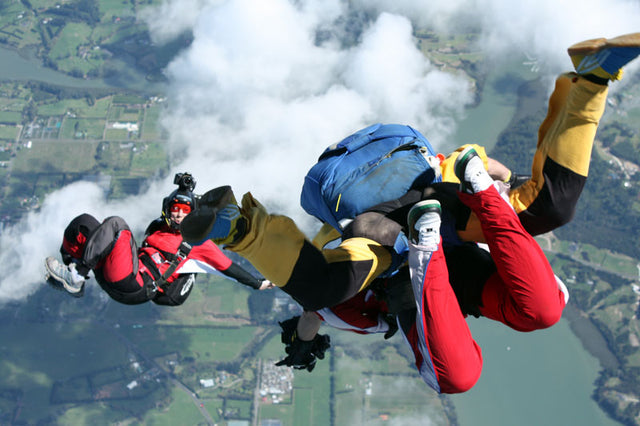 The NZ Air Force transport aircraft reaches the drop altitude in just a few minutes. The drop speed is about 280 km/h. The jump time between the tandems is only a few seconds due to the high speed of the machine. Every time an adventure even for experienced skydive instructors like Freddy and his New Zealand camerawoman.